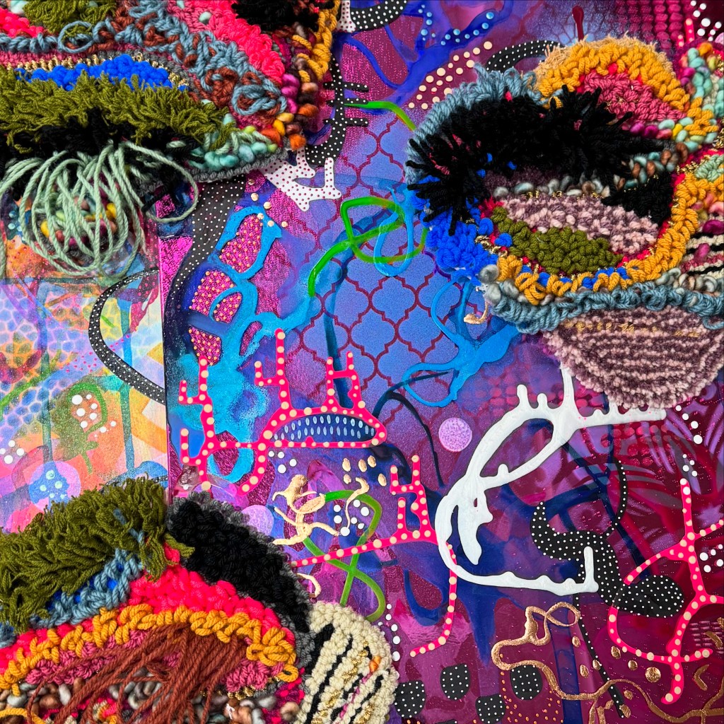 Rebecca’s unique and creative response to the Australian landscape is detailed and vibrant. Her compositions have been described as a kaleidoscope of colour and decorative markings that take the viewer on an adventurous journey. The many layers within Rebecca’s tufted tapestries and mixed media paintings are collaged, revealing hints of flora and a blend of textures and colours that celebrate the subject matter.